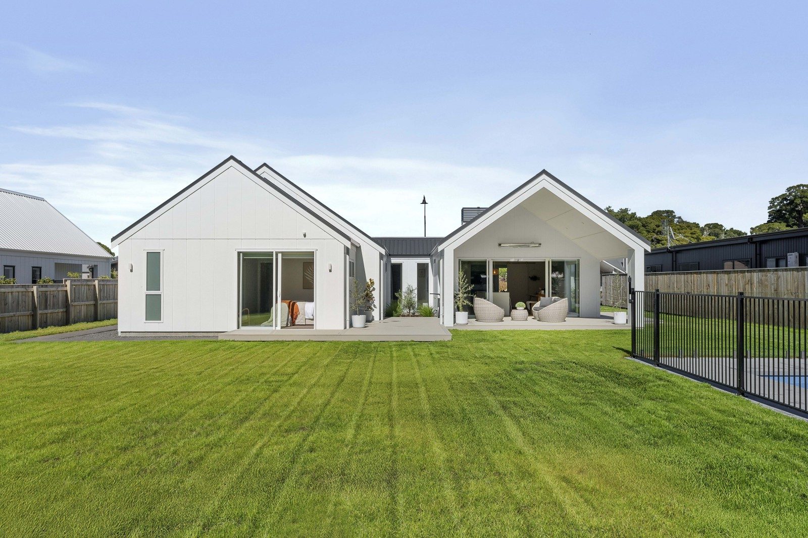 The exterior pairs Stria and Axon cladding for a crisp, modern finish that stands out against the surrounding landscape. Inside, light-filled rooms flow effortlessly towards a covered outdoor entertaining area, complete with a heated saltwater pool, perfect for long summer evenings and relaxed weekends.